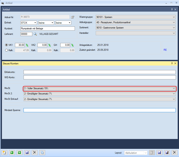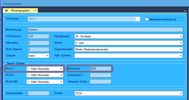 Wenn Ihre Stammdatenstruktur eine generelle Umstellung des Steuersatzes auf Warengruppenebene nicht zulässt, müssen Sie die Umstellung auf Artikelebene durchführen. Beachten Sie bitte auch hier das Erlöskonto. Sie finden die Steuersätze im Unterfenster „Steuer/Konten“ des Artikelmenüs.