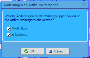 Wenn Sie anschließend die Warengruppe speichern, erscheint die Frage, ob die Änderung an alle Artikel dieser Warengruppe weitergereicht werden soll. Wählen Sie die Felder an und bestätigen Sie die Frage bitte mit OK.